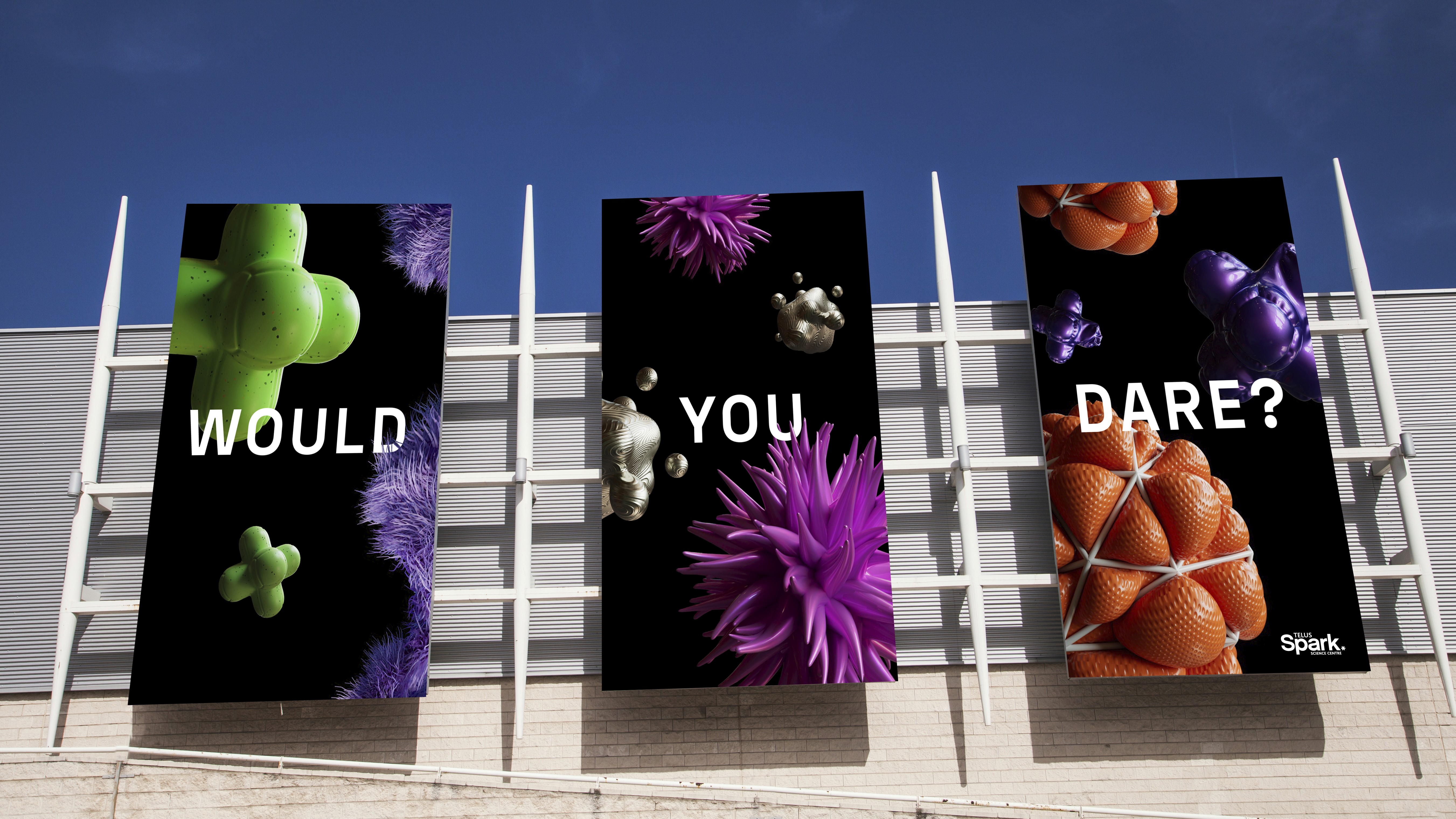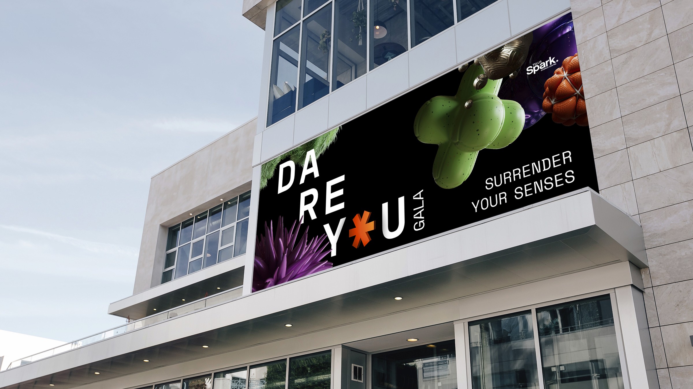 Gala for Telus Spark Science Centre to raise donation money for expansion and continuation of programs. I was able to create an animation for Keep Calgary curious as well as build out the Dare You Gala brand Identity. Dare You blends the organic and synthetic into a futuristic identity for the 2023 gala at Telus Spark Science Centre. Custom 3D renderings brought the vision to life, simulating soft foam-like textures, glossy metallics, and vibrant plastics to explore artificial materials.